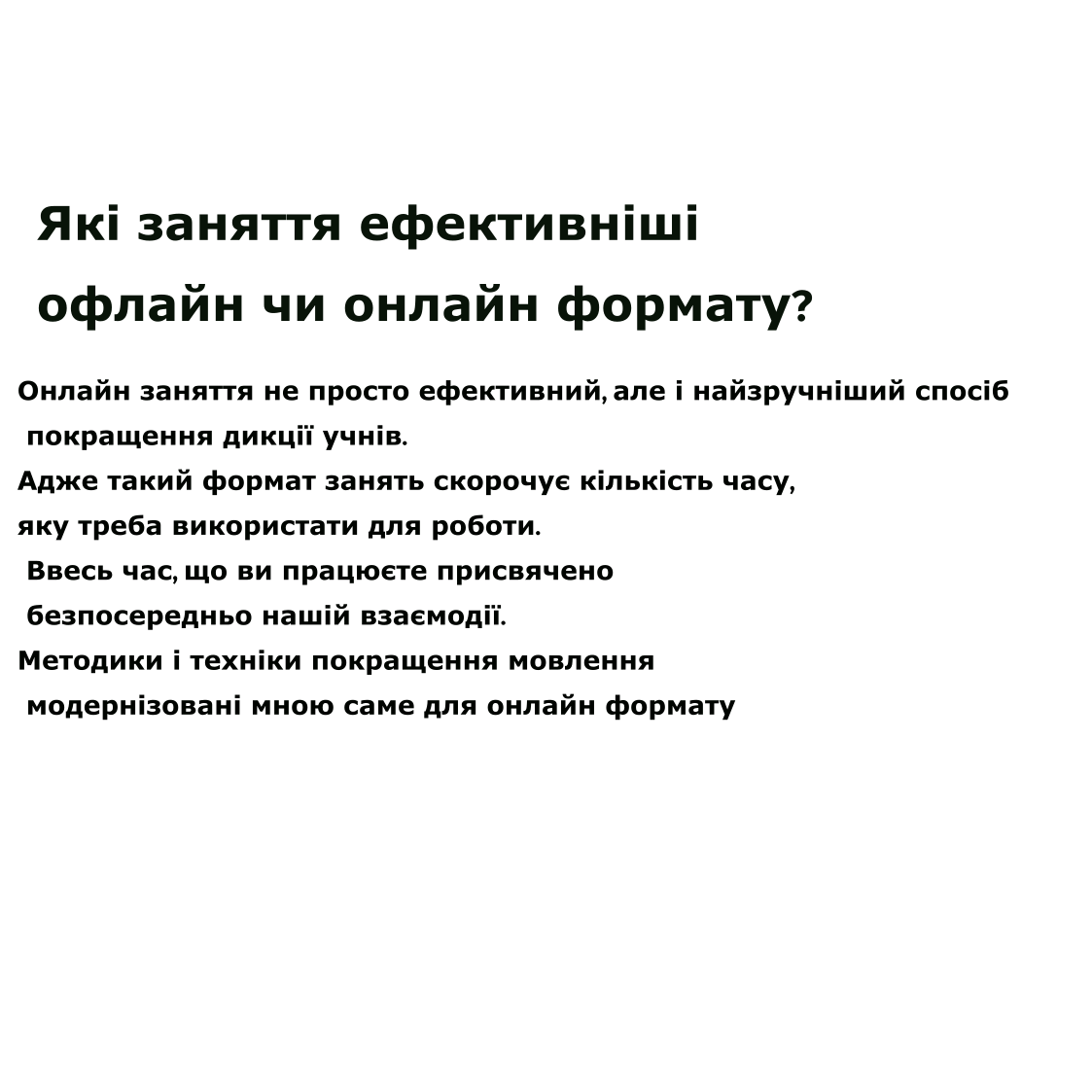 Консультація включає діагностику всіх сторін мовлення, щоб визначити чи є потреба в логопедичних заняттях та що саме у мовленні дитини потребує корекції. Після цього я пояснюю рекомендовані шляхи корекції.